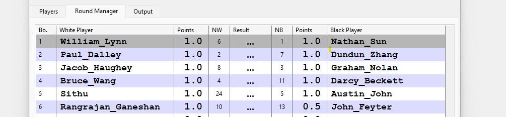 Tie breaks will be according to the NZ standard 1. Direct Encounter. 2. Cumulative (Sum of Progressive Scores). 3. Total Buchholz. 4. Sonneborn-Berger. 5. Buchholz Cut1. If still tied the award will be shared.