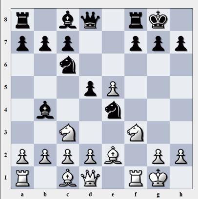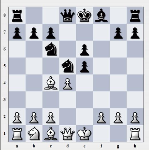 1.e4 e5 2.Nf3 Nc6 3.Bc4 Nf6 4.d4 exd4 5.Ng5 Ne5 6.Qxd4 Nxc4 7.Qxc4 d5